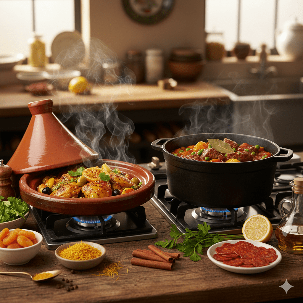 炖煮和慢炖:两种文化都擅长慢炖菜肴。摩洛哥塔吉锅,一种专为温和长时间烹饪设计的陶罐,在西班牙的炖菜(guisos 和 estofados)中找到了共鸣,这些炖菜都优先考虑将肉类和蔬菜炖煮至完美软烂。